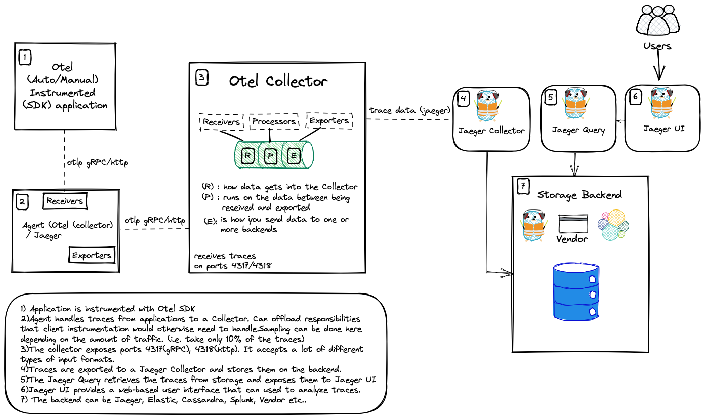 The storage backend can be Jaeger, Zipkin, Elastic, Cassandra, Tempo, Splunk, a vendor (Honeycomb, Lightstep, Signoz, Logz.io, Aspecto etc..).