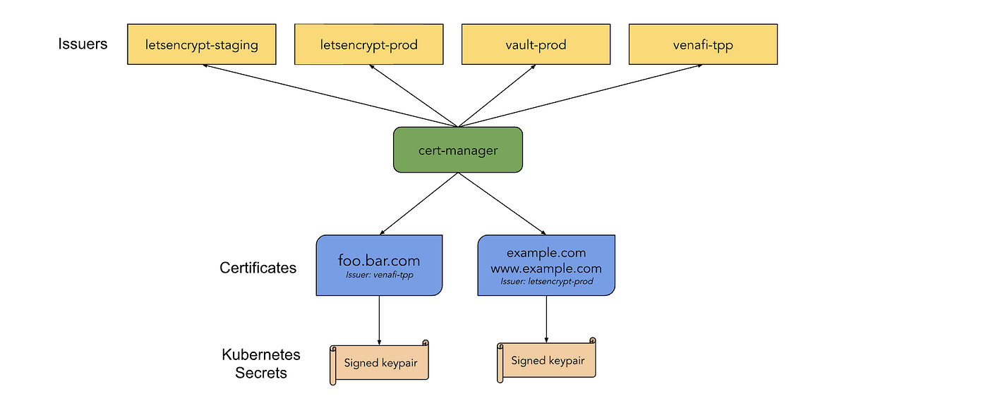 Before being able to request certificates, you must create CA resources: Issuer or ClusterIssuer. They are used for signing CSRs (certificate requests). The difference between these resources is that ClusterIssuer is non-namespaced and can be used in multiple namespaces: