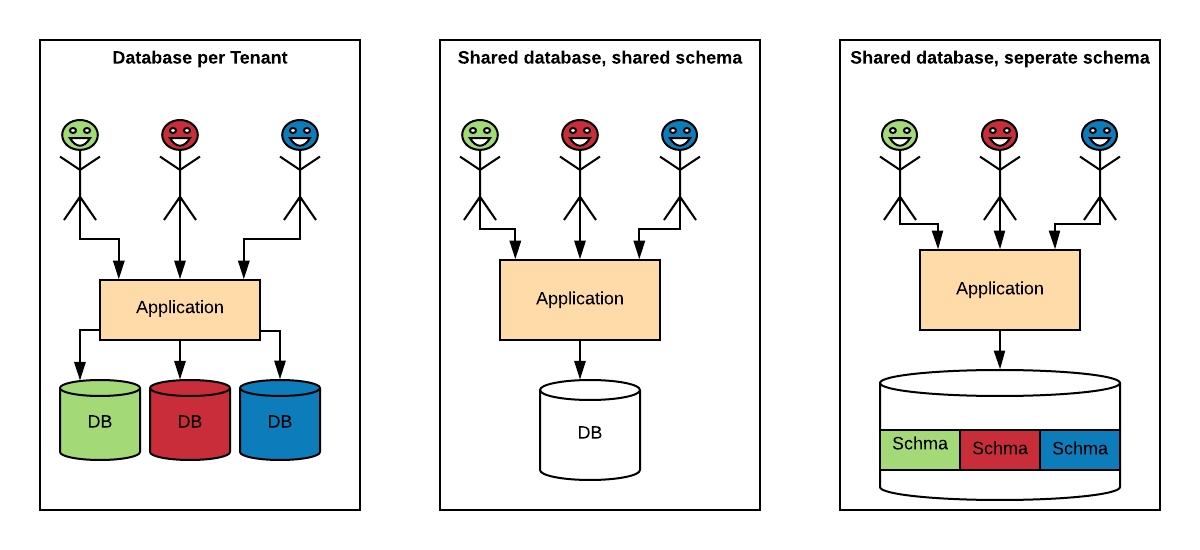 Shared Database, Shared Schema: All Tenants share a database and tables. Every table has a Column with the Tenant Identifier, that shows the owner of the row.