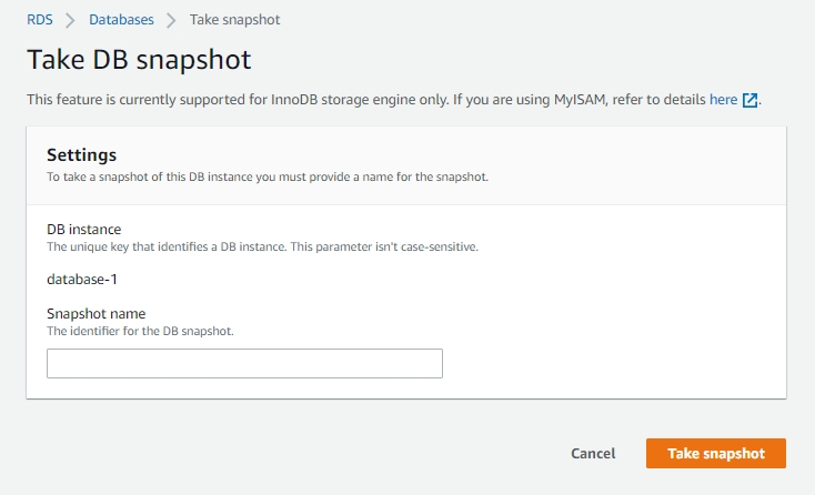 This will create a manual snapshot of the DB instance that you created.
